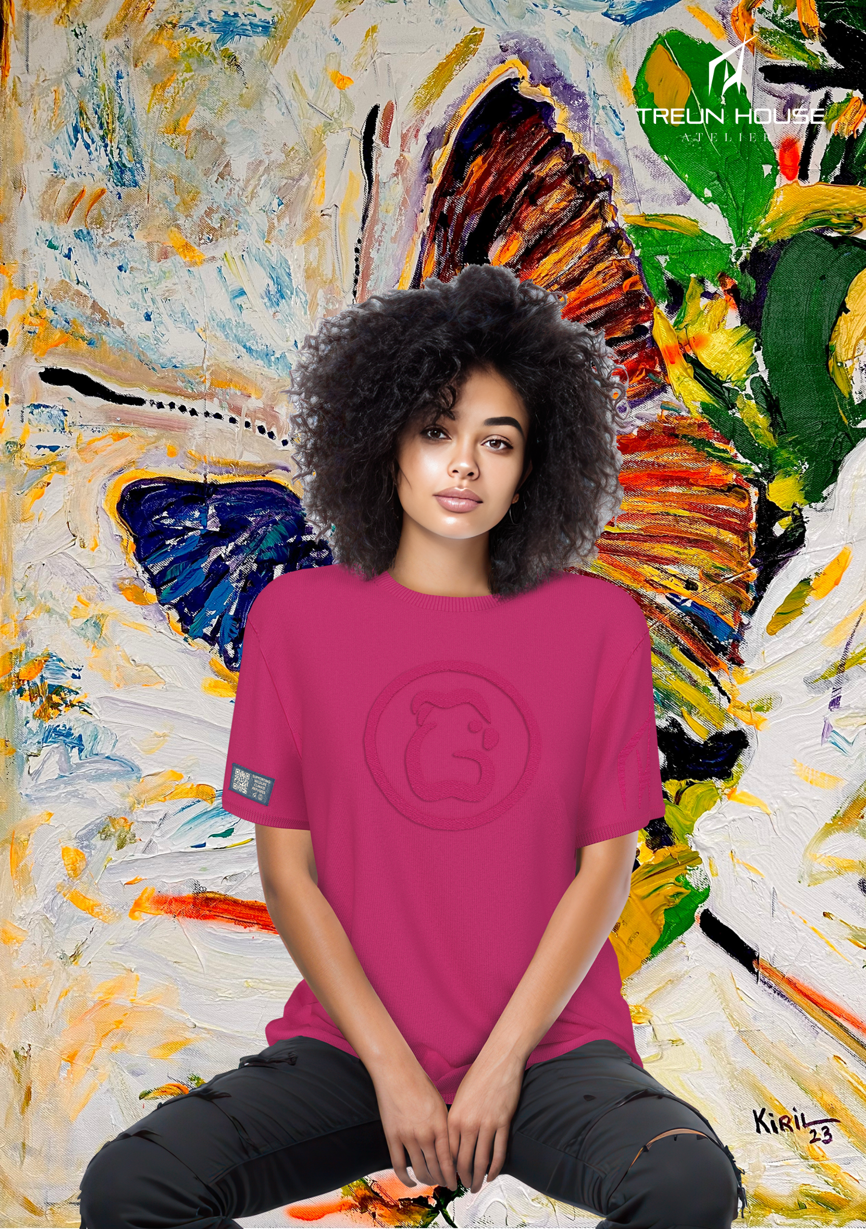 The artist's dynamic brushstrokes and vivid color palette inspired the choice of ten colors for the fashion capsule, each one named after the wildlife listed as endangered in Australia.